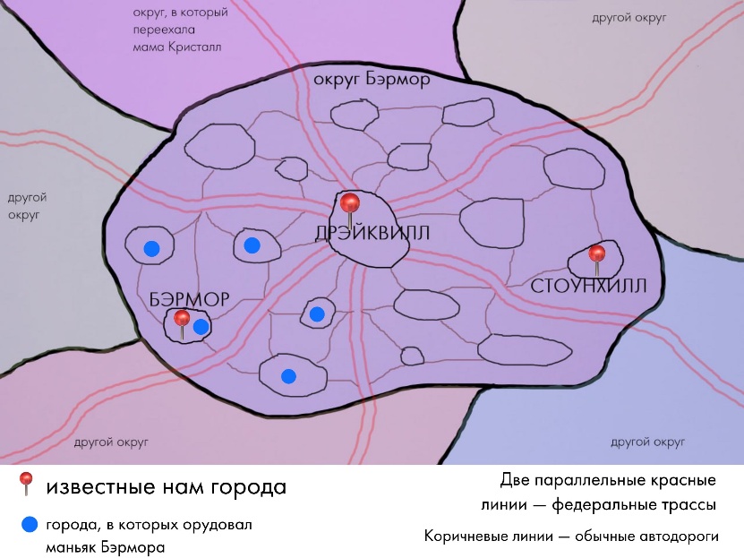 Дрэ́йквилл – вымышленная локация, не имеющая ничего общего с реальным городом Дрейксвилл (округ Дейвис, штат Айова). Дрэ́йквилл расположен в том же вымышленном округе, что и Бэ́рмор. Вселенная у этих историй одна, но сюжеты разные и не связаны между собой. Однако Призраков мы ещё увидим.