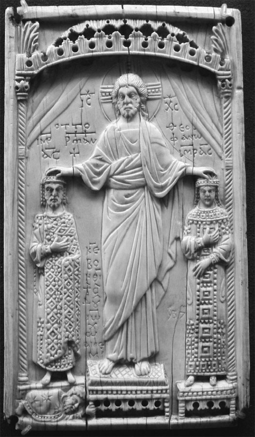 Табличка из слоновой кости с греческими и латинскими буквами, изображающая коронацию императора Священной Римской империи Оттона II и императрицы Феофаны в 982–983 гг.
