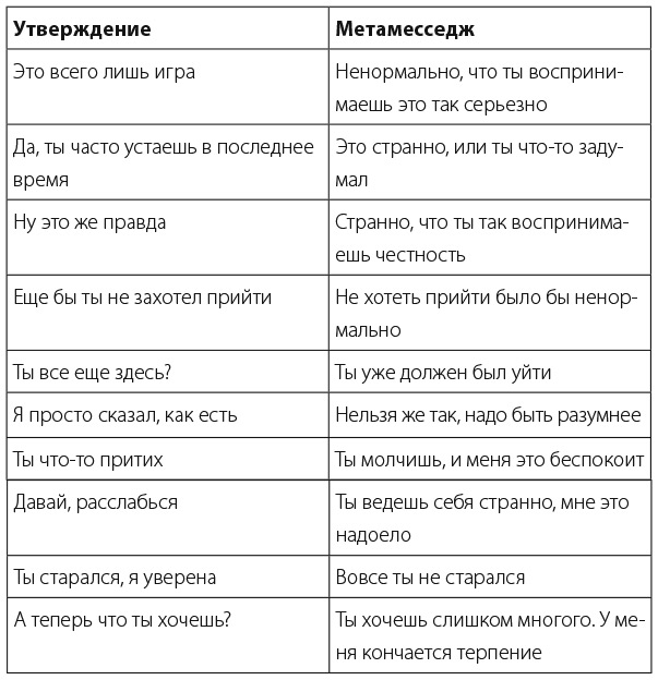 Второй пункт очень важен. Если не проверить свою версию, вы так и будете теряться в догадках и вести себя, как будто правильно поняли метамесседж, не зная наверняка. К тому же такое уточнение – хороший урок для любителей изъясняться метамесседжами. Если регулярно переспрашивать, человек начнет говорить с вами прямо, проговаривая все мысли и чувства.