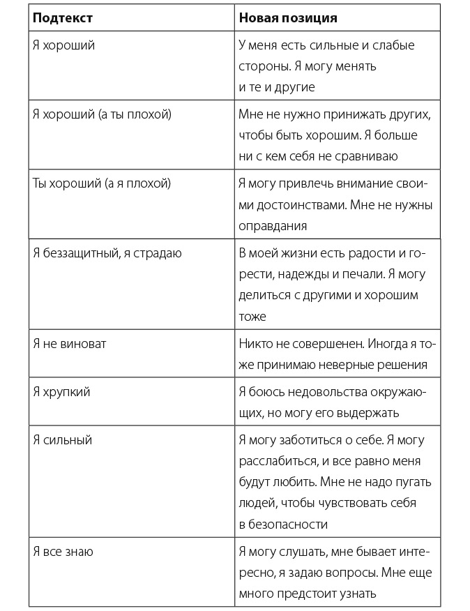 Позиции сформулированы как инструкции, мантры, которые можно повторять многократно в ситуациях, обычно провоцирующих подтекст. Можно взять эти формулировки в качестве личного девиза, записать и повесить, например, на зеркало.