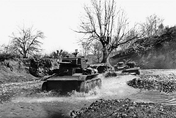 Что касается последнего – двадцатого «Тетрарха», то он был направлен для испытаний на НИИБТ Полигон в подмосковную Кубинку. Здесь танк подвергся всесторонним испытаниям. К числу его достоинств советские специалисты отнесли удобство управления, хорошую подвижность, проходимость и маневренность. Танк оказался довольно неприхотливым к типу используемого топлива. Но при этом, конечно, имел слабое бронирование. Попытки оснастить его дополнительными бронелистами оказались неудачными, так как догруженный танк терял свою подвижность и проходимость, а двигатель при движении без дорог перегревался. Без дополнительной же брони огневая мощь и подвижность танка МК^П оказались сравнимыми с Т-26, БТ и Т-70 при меньшей массе.
