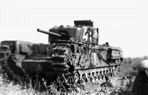Танк «Черчилль IV» 10-го гвардейского танкового полка прорыва, подбитый и оставленный на немецких позициях. Воронежский фронт, 1-я танковая армия, июль 1943 года