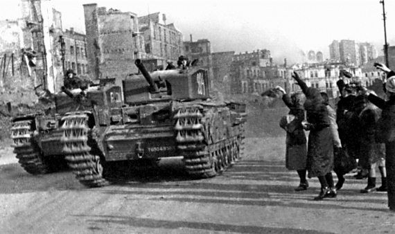 Киевляне приветствуют освободителей – танки МК-IV («Черчилль III») 48-го отдельного гвардейского танкового полка прорыва. Ноябрь 1943 года