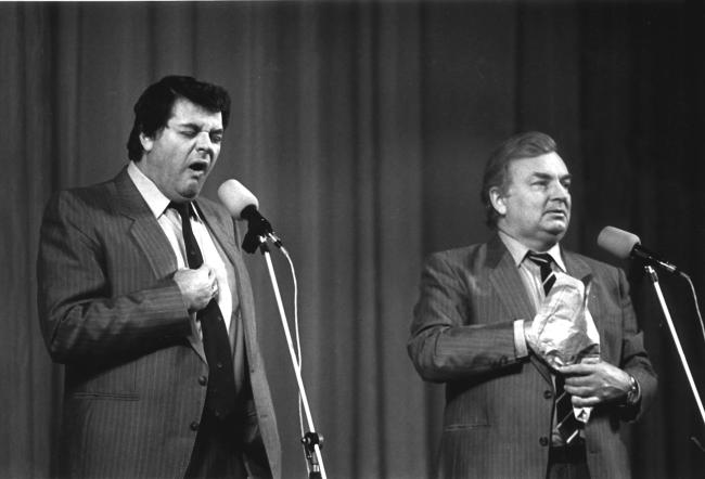 Страсть к «эстрадному» пребыванию родилась у нас с Михаилом Михайловичем с «капустников» еще в первом нашем совместном театре (а мы их вместе поменяли в своей жизни три, включая, надеюсь, последний – Театр сатиры), в Театре имени Ленинского комсомола, куда мы попали со студенческой скамьи и где прожили разную, но веселую и молодую актерскую жизнь. У нас с Мишей есть одна эстрадная зарисовка, которая сопутствует нам уже более тридцати лет и, как нам кажется, не стареет. Долгожительство ее предопределено формой. Державин (не владеющий, к сожалению, впрочем, как и я, ни одним зарубежным языком) имеет патологическую способность к имитированию мелодики разных иностранных языков на словесной абракадабре… Номер строится как интервью с приехавшим иностранным гостем со всеми нюансами советского перевода, где говорится явно одно, а переводится явно другое. Где гость говорит в течение двух-трех минут, а перевод звучит как «Здравствуйте, друзья!». Эта форма проверила себя десятилетиями и не стареет, ибо «резиновая». В каждой ситуации, в каждой аудитории, в каждый данный момент она наполняется сиюсекундным содержанием, что приводит публику в некое ошеломление. Действительно, приезжая на какой-нибудь провинциальный завод, мы до концерта расспрашиваем местных об острых проблемах производства, узнаем об одиозных фигурах данного предприятия, и когда на сцене «иностранец» говорит, что он потрясен женщинами номерного завода, после этого закатывает глаза и с вожделенным вздохом произносит: «О! Григорьева», а я «перевожу»: «Он без ума от Камзолкиной», – зал встает в едином порыве, ибо никак не может понять, откуда заезжие столичные артисты могут знать фамилии главного бухгалтера предприятия и начальника ВОХРы (военизированной охраны).
