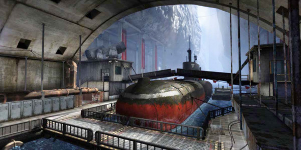 На уровне «Balaclava Submarine Pen» из Ghost Recon: Phantoms (2012, Ubisoft Singapore) противоборствующие команды стартуют в тоннелях по обе стороны дока с подводной лодкой. Каждый тоннель с местом появления игроков отделен от поля боя «точкой невозврата», для прохода через которую нужно обязательно спрыгнуть с возвышенности.