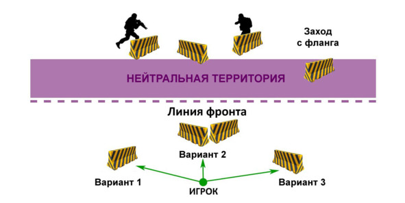 Организация фланговых атакДобавить изюминку в перестрелки помогает организация фланговых атак, создающая условия для прорыва линии фронта. Как правило, заход с фланга представляет собой символичный мостик из укрытий через линию фронта, цель которого дать шанс участнику сражения безопасно подобраться к врагу на максимально близкое расстояние.