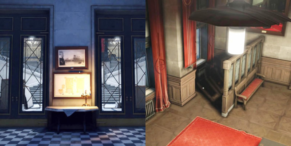 В качестве примера рассмотрим уровни из Dishonored (2012, Arkane Studios). Когда главный герой возвращается во дворец императрицы и попадает внутрь через парадный вход, то от большого зала с лестницей его отделяет дверь с прозрачными окнами.