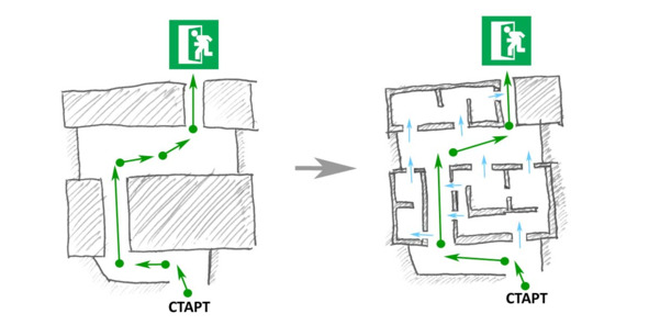 Нелинейная структураБазовая структура любого уровня, даже если это песочница, обычно состоит из точки входа (место появления игрока) и выхода (конечная цель). Пространство между ними обычно называют геймплейной секцией.