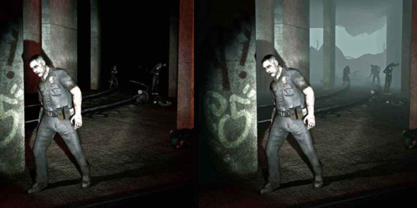 Хорошим приемом для повышения читаемости персонажа является использование атмосферных эффектов. Посмотрите, насколько плохо читаются силуэты зомби в темном тоннеле метро из Left 4 Dead (2008, Valve) и как хорошо их становится видно в легкой дымке.