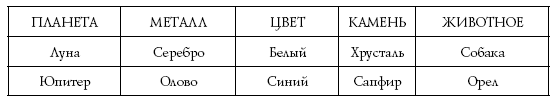 Белый цвет, как и серебро, подходит для Луны, а хрусталь – прозрачный и блестящий – напоминает о ее сиянии. Небесные тела сияют, а способность отражать свет делает металл блестящим. Золото и серебро как будто светятся изнутри, и это наряду с цветом связывает их со светоносными дисками Солнца и Луны. Связь с собакой более туманна.