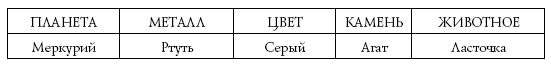 Меркурий известен своей быстротой и порывистыми скачками – ретроградной фазой. Его металлом является ртуть, жидкая при комнатной температуре и текущая быстрее, чем вода. Ртуть как будто обладает собственной жизнью. Этот металл так тесно ассоциируется с Меркурием (планетой и божеством), что в Средние века ртуть часто называли меркурием. Серый цвет уместен для ртути, а воздушная акробатика объясняет сравнение с ласточкой – быстрой и подвижной, как ртуть. С другой стороны, возникновение ассоциации Меркурия с агатом остается загадкой. Возможно, многочисленные разветвления кристаллов в моховом агате наводят на мысль о многовариантности действий этого божества. Астрологический символ этой планеты похож на символ Венеры, но увенчан лежачим полумесяцем. Иногда считается, что это стилизованное изображение кадуцея, геральдического жезла Гермеса.