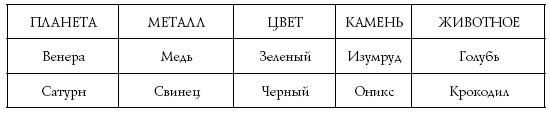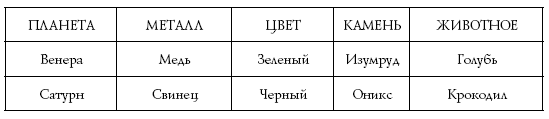 Астрологическим символом Венеры служит крест, увенчанный кругом. Считается, что он изображает стилизованное зеркальце – подходящая эмблема для богини любви и красоты. Медные зеркала были в ходу в античной Греции. Но этот факт лишь отражает фундаментальную связь между металлом и планетой. Ее можно проследить, но сначала мы должны составить полный список соответствий. Планеты и металлы были лишь его частью. Цвета, драгоценные камни и эмблематические животные тоже играли важную роль.