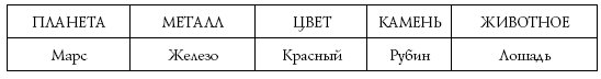 Марсу, красной планете, по логике вещей принадлежит рубин, а его цвет выражает настроение бога войны: в сражениях проливается кровь. Астрологический символ Марса – круг со стрелкой, отходящей вправо и вверх от кольца – обозначает щит и копье. Животным Марса является лошадь – возможно, потому, что лошадей запрягали в боевые колесницы. Железо тоже подобает Марсу как властелину воинов; самое лучшее и дорогое оружие две тысячи лет назад изготовлялось из железа. Богатая железом почва часто имеет красноватый оттенок, и именно из-за насыщенности марсианской почвы окислами железа эта планета с Земли кажется красной.