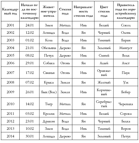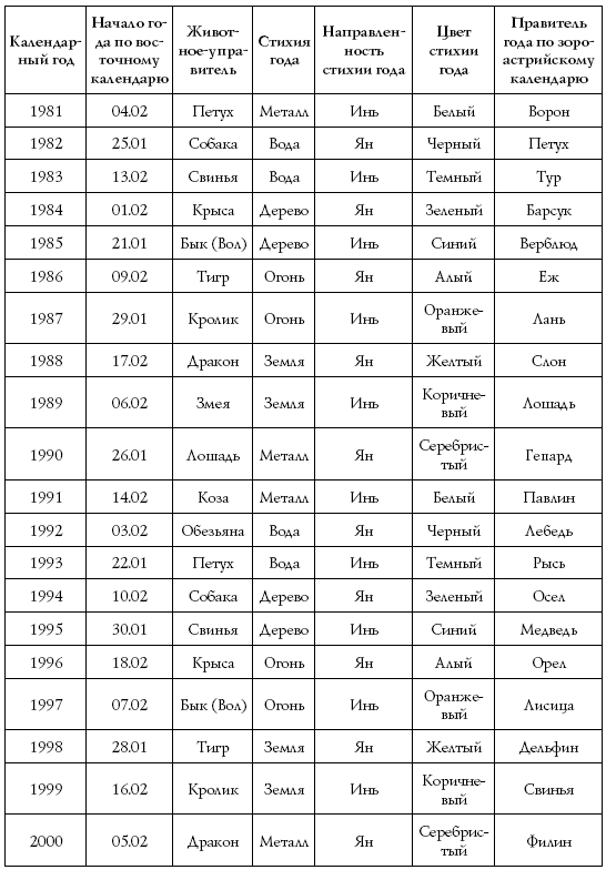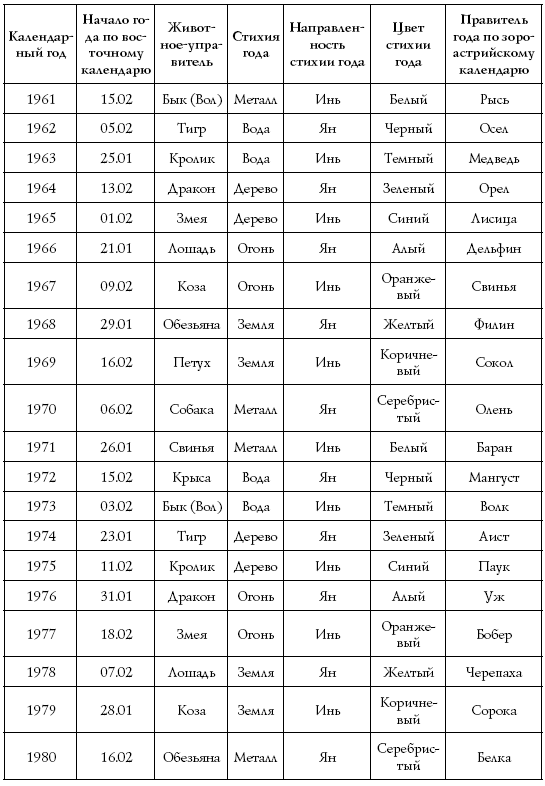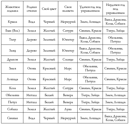 В таблице № 1 указаны изначальные стихии животных зодиакального круга, присущий им цвет (родной цвет), а также удачные и неудачные годы, имеющие дружественных и враждебных управителей. Отыскав в таблице управителей удачных годов, обратитесь к следующей таблице № 2, где приводится начало каждого нового года по китайскому календарю, и сделайте выводы.
