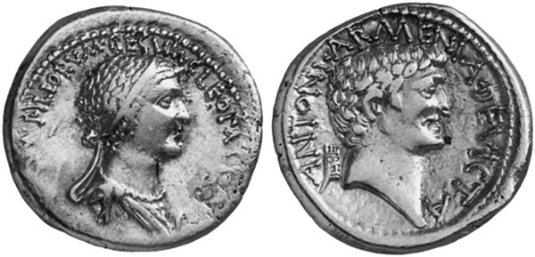 Серебряный денарий с изображением Антония (справа) и Клеопатры (слева).