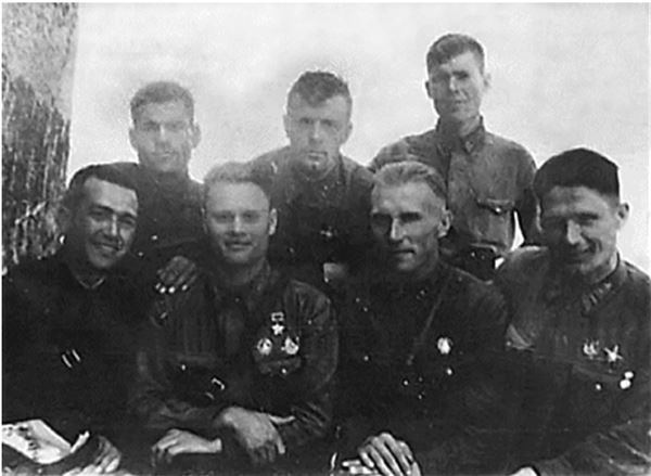 Летчики 43-го истребительного авиаполка. Слева направо сидят: военком 2-й авиаэскадрильи И.Е. Златин, командир авиаэскадрильи В.И. Шишкин, командир звена Л.И. Борисов, зам. начальника штаба полка Юрасов; стоят: техник Николай Погосян, начальник штаба полка Крупчатников, техник Дьячук. Сталинград. Лето 1942 г. (Фото из семейного архива В.И. Шишкина)
