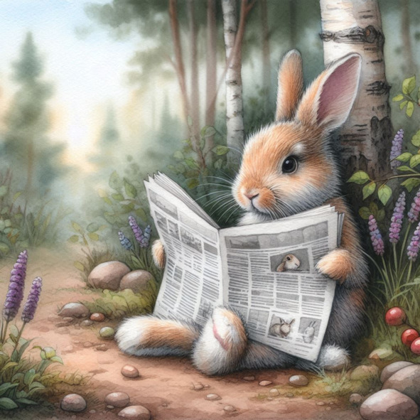Он бежал-бежал, пока не проголодался, и принялся осматриваться по сторонам в поисках пищи. На глаза Кролику попалась скомканная газета, он стал её жевать и попутно проглядывать разные интересные заметки и статьи.
