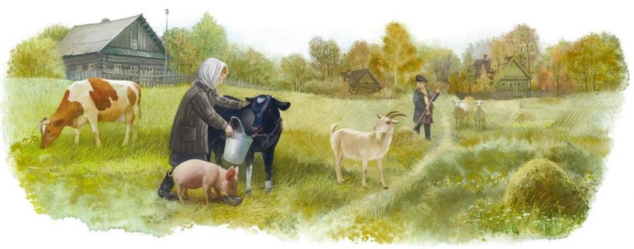После родителей всё их крестьянское хозяйство досталось детям: изба пятистенная, корова Зорька, телушка Дочка, коза Дереза, безыменные овцы, куры, золотой петух Петя и поросёнок Хрен.