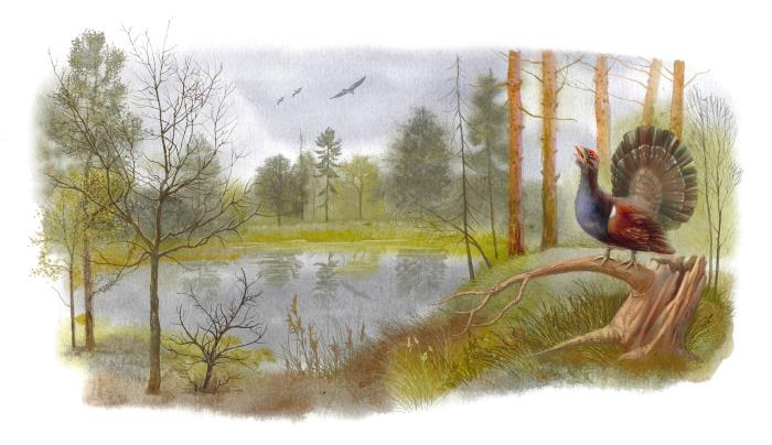 – Тэк-тэк! – чуть слышно постукивает огромная птица Глухарь в тёмном лесу.