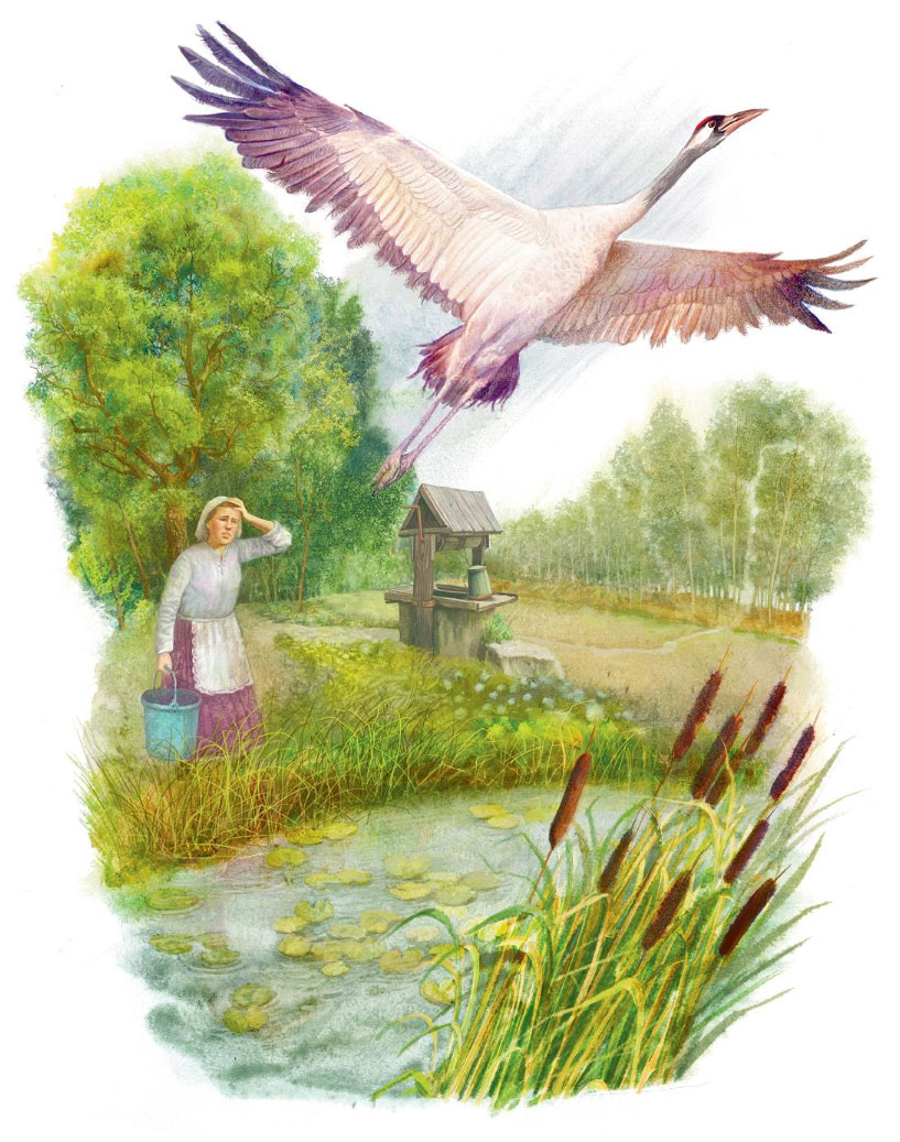 Раз пошла жена за водой вниз, к болоту, и Журка за ней. Лягушонок небольшой сидел у колодца и прыг от Журки в болото. Журка за ним, а вода глубокая, и с берега до лягушонка не дотянешься. Мах-мах крыльями Журка и вдруг полетел. Жена ахнула – и за ним. Мах-мах руками, а подняться не может.
