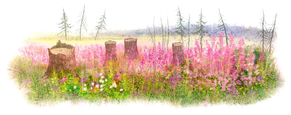 На вырубке вокруг старых чёрных пней было множество высоких, ёлочкой, красных цветов, и от них вся вырубка казалась красной, хотя гораздо больше тут было иван-да-марьи – цветов наполовину синих, наполовину жёлтых. Во множестве тут были тоже и белые ромашки, звонцы[5]5
