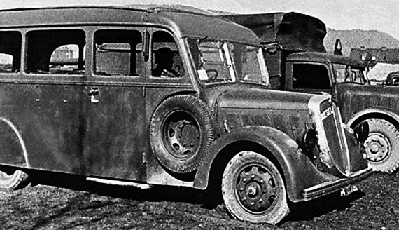 На переднем плане – автобус на шасси «Австро-ФИАТ» несколько усовершенствованной 3,5-тонной модели «AF-HRM6» с 80-сильным мотором «МАН» образца 1938 года. На заднем плане – весьма редкий 5-тонный «ОАФ-FD6» 1940 года. Обе модели, несмотря на малое их количество, применялись в вермахте до конца войны.