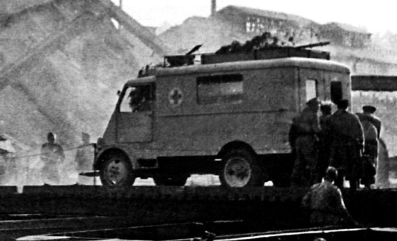 Трофейный санитарный фургон «Пежо-DМА» в Красной Армии. Переправа через памятную с времен нашествия Наполеона реку Березину. Лето 1944 года.