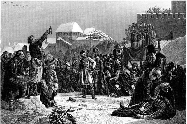 Подъехав, князь спустился из саней. К нему подошел стрелецкий пятидесятник и спросил, указывая на толпу богомольцев: