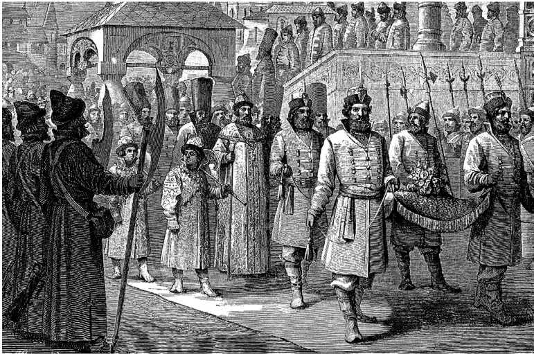 Несмотря на ранний час, улицы Москвы уже пробудились. Открывались лавки, раскладывались товары на ларях. Громоздкие экипажи бояр и других знатных людей направлялись на поклон государю. Доехав до дворцовой ограды, несмотря на возраст и высокое положение, все пешком идут через двор – уважение к царскому дому не дозволяло подъезжать к крыльцу.