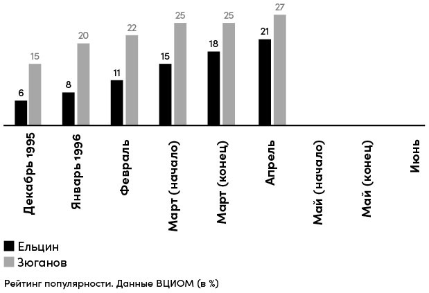 Содержание встречи бизнесменов с Зюгановым производит на Коржакова сильное впечатление. Он считает, что почти добился своего – убедил всех в необходимости перенести выборы. Они кажутся Коржакову абсолютным злом: «Я вижу две опасности, – сетует глава президентской охраны в конце апреля. – Сатаров, Илюшин, Малашенко, Чубайс хотят столкнуть Ельцина с Зюгановым. А пока они будут друг с другом препираться, Явлинский наберет больше всех голосов. Есть и другая опасность – они так ухандокают шефа, что он заболеет и попадет в больницу».