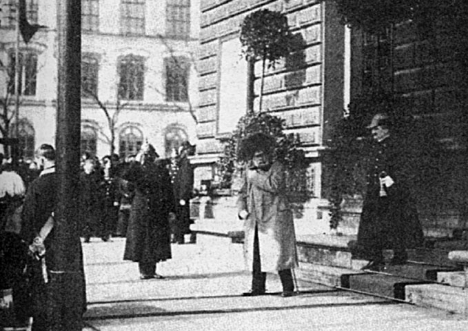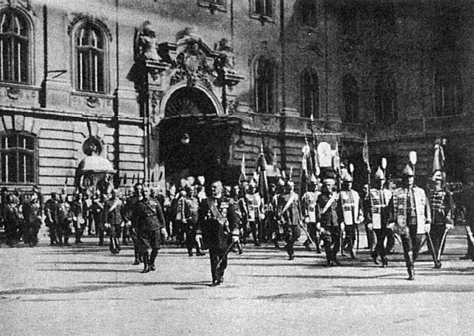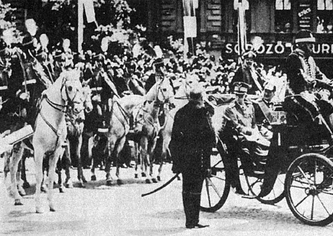 Император покидает Весеннюю выставку в Вене в сопровождении Хорти