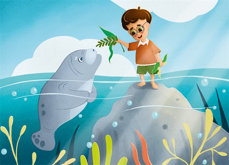 Мальчик решил помочь ламантину и собрать для него зелень на берегу. Он долго ходил и выбирал, что может прийтись по вкусу речному обитателю. Наконец собрал охапку зелени и положил ее перед водным жителем. Ламантин с удовольствием принял угощение и потерся головой о ноги Никиты.