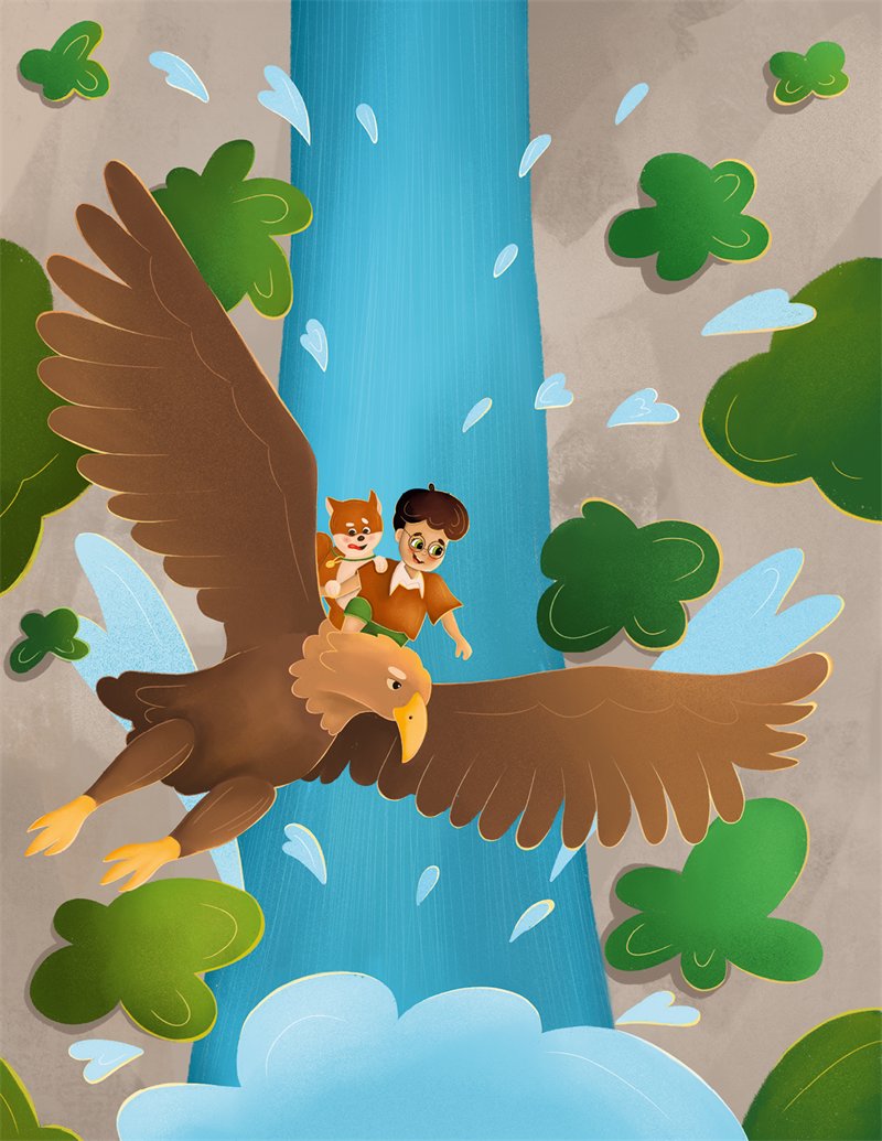 Друзья забрались на спину орла, и гордая птица взмыла в небо. Затем орел стал медленно спускаться, и Никита увидел колоссальную массу воды, низвергающуюся с обрыва.