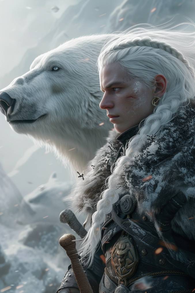 От монолитной скалы отделилась фигура. Коренастый беловолосый мужчина. Длинные пряди заплетены в косы. Белесые брови на суровом лице нахмурены. За поясом толстой шубы видны рукояти кинжалов. Выглядит незнакомец опасно. Но менее опасно, чем тот, кто лениво следует вслед за ним. Большущий белый медведь.