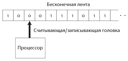 Машина Тьюринга состоит из: а) бесконечно длинной цифровой ленты, b) выходной цифровой ленты и c) процессора, который переводит входную информацию в выходную в соответствии с неким фиксированным набором правил. Это основа всех современных цифровых компьютеров.