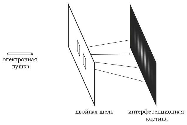 Но теперь изменим этот эксперимент, заменив световой луч пучком электронов. Если пропустить пучок электронов сквозь две щели в первом листе бумаги, то следовало бы ожидать, что на втором листе в соответствующих местах появятся две четкие яркие полоски. Поскольку электрон считался точечной частицей, он должен был пройти либо сквозь первую щель, либо сквозь вторую, но не сквозь обе сразу.