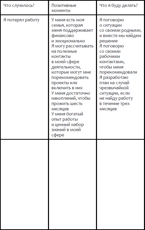 Если вы переживаете сложный момент или болезненную ситуацию, очень важно защитить себя от безнадежности или выйти из ее негативного круга. Вот схема, которая поможет вам найти положительное в отрицательном. Запишите ситуацию, которую вы переживаете, а затем составьте список положительного, что окружает вас в данный момент.