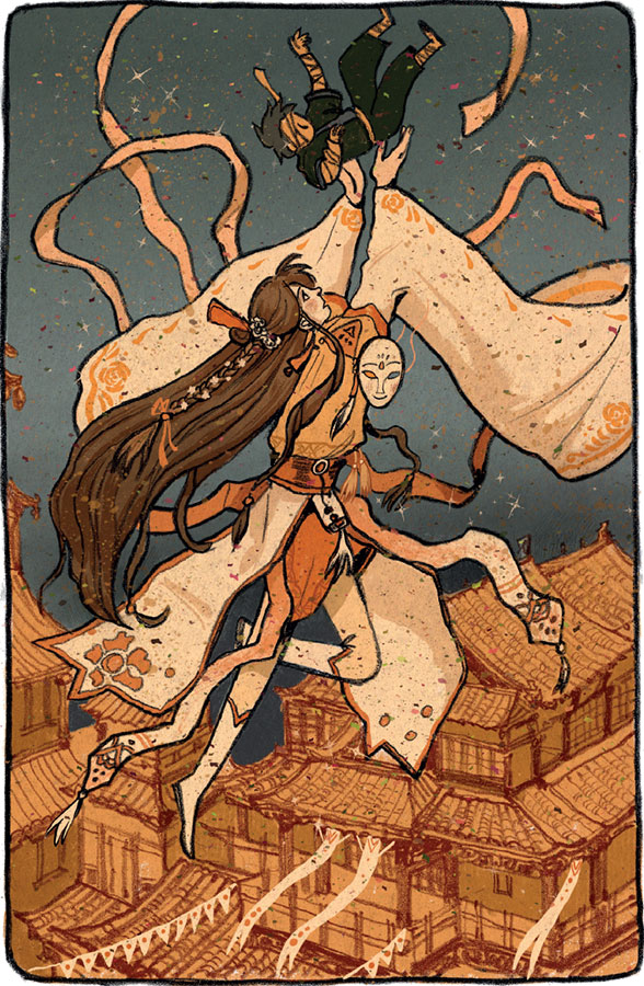 В день фестиваля народ наводнил улицу Шэньу. Знать болтала и смеялась на верхних этажах высоких зданий, а дворцовая стража, облачённая в воинственно бряцающую броню, прокладывала дорогу через толпу зевак. Молодые девушки кружились в изящном танце, их белоснежные руки рассыпали дождём цветочные лепестки, застилая ими небо, – и спроси любого, кто прекраснее, цветы или танцовщицы, он замешкался бы с ответом. Из золотых повозок музыка разливалась по всему Запретному городу[1]1
