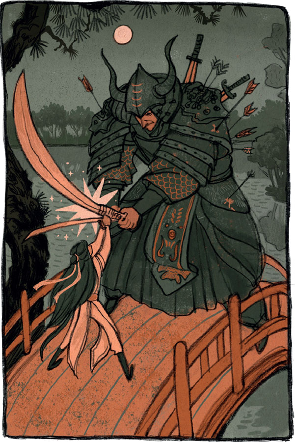 Битва продолжалась, пока тьма не разлилась по небу и мрак не укрыл землю. Наследник престола был весьма искусен во владении мечом; призрак же был отчаян и очень страшен. Пока человек и демон сражались на мосту, солнце и луна сменили друг друга, и в конце концов злой дух был повержен.