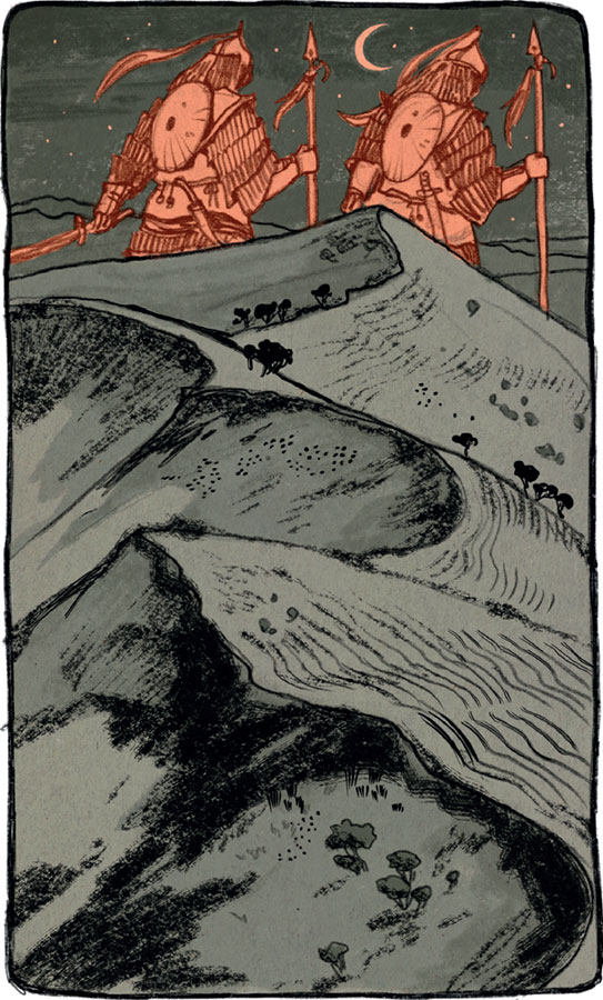 Государства не стало, но ненависть советника и солдат никуда не делась. Некогда Баньюэ располагалось на плодородной почве оазиса, а после того, как обрушилась тьма, песок поглотил его. Прежде в окрестностях города жили десятки тысяч людей, но все они постепенно разъехались. И в то же время некоторые путешественники продолжали утверждать, что видели вдалеке очертания высоких, вооружённых шипастыми палицами воинов, что бродят меж дюн – не то охотятся, не то охраняют свою территорию. А затем пополз слух об исчезающих людях: мол, всякий раз, когда караваны из Центральной равнины следуют на запад, им приходится оставлять в пустыне половину жизней в качестве платы…