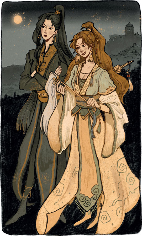 – Ой, послушай, – воскликнула Повелитель Ветра, – ну к чему такая спешка? Чем дольше ты ворчишь, тем дольше тянется разговор! – Но всё же развернулась и вытащила из-за пояса складной веер. – Ваше высочество наследный принц, если у вас нет ко мне вопросов, тогда до встречи в небесных чертогах?