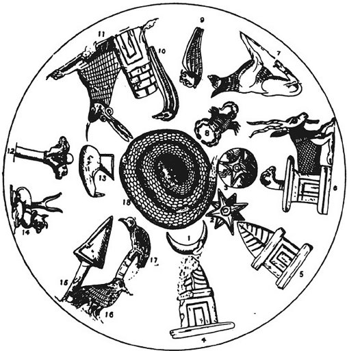 Символы божеств, изображенные на акте о земельных пожалованиях – кудурру – царя Мардук-апла-иддина I: 1 – Син, 2 – Иштар, 3 – Шамаш, 4 – Ану, 5 – Энлиль, 6 – Эа, 7 – Нинкарраг (Гула), 8 – Ишхара, 9 – Нергал, 10 – Забаба, 11 – Набу, 12 – Нинурта, 13 – Нуску, 14 – Адад, 15 – Мардук, 16 – Бау, 17 – Шукамуна (касситское божество), 18 – Иштаран