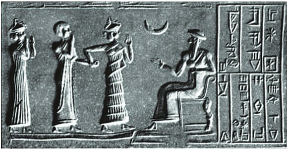Поклонение богу Луны. Цилиндрическая печать Хашхамера, энси Ишкун-Сина (в Северной Вавилонии). Ок. 2400 г. до н. э. Британский музей. Великобритания, Лондон