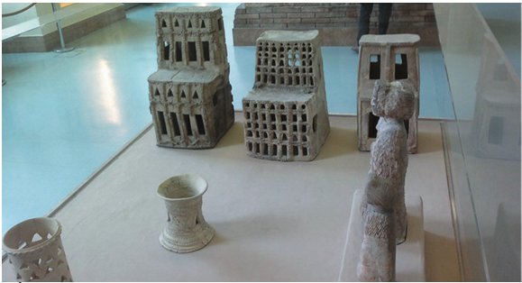 Инсталляция архаического храма Иштар с храмовым инвентарeм (курильницы, ступенчатый алтарь) и статуэтками молящихся. Ашшур, ок. 2400 г. до н. э. Музей Пергамон. Берлин, Германия