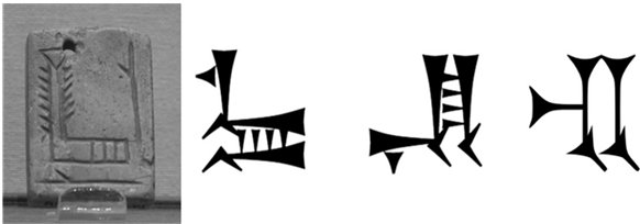 Клинописный знак EN, обозначающий «господин», или «мастер»: эволюция от пиктограммы трона на табличке с именем богини Инанны (ок. 3000 г. до н. э.) с последующим упрощением и вращением (ок. 600 г. до н. э.). Галерея Древнего Ближнего Востока, Лувр. Париж, Франция