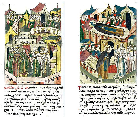 Смерть князя Дмитрия Александровича (справа), миниатюра из Лицевого летописного свода, XVI век.