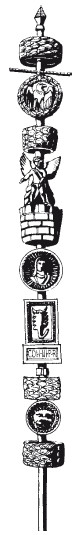 [Закрыть] воинских частей украшали не одной, а многими наградами. На сигне помещались венки, фалеры и другие знаки отличия легиона, а высшей наградой для него было пурпурное квадратное знамя, свисающее с перекладины шеста, увенчанного римским орлом.