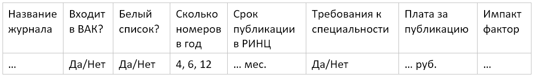 Используйте eLIBRARY, чтобы найти издания по вашей специальности. Сформируйте таблицу с основными характеристиками журналов: название, индексируемость, тематика, сроки рецензирования, наличие публикационного взноса. Выберите 10–15 журналов, в которые вы подадите статью в первую очередь.