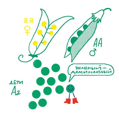 У мамы-гороха с желтыми семенами и папы-гороха с зелеными все дети будут с зелеными семенами, потому что зеленый цвет – доминантный («сильный») признак. Это означает, что он будет проявляться всегда, если у одного из родителей семена зеленые. А вот если бы мама-горох и папа-горох были с желтыми семенами, то и у детей все горошины получились бы только желтыми. Признак, который наследуется по таким правилам, называется рецессивным («слабым»).