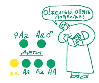 Посмотрим, какое потомство будет у гороховых детей – тех, что с зелеными семенами. Мы знаем, что у их мамы горошины желтые, а у папы – зеленые. А это значит, что дети этих детей будут вновь и с зелеными, и с желтыми семенами. Так как желтый цвет – рецессивный признак, то он проявится у меньшей части потомства, а точнее у четверти.